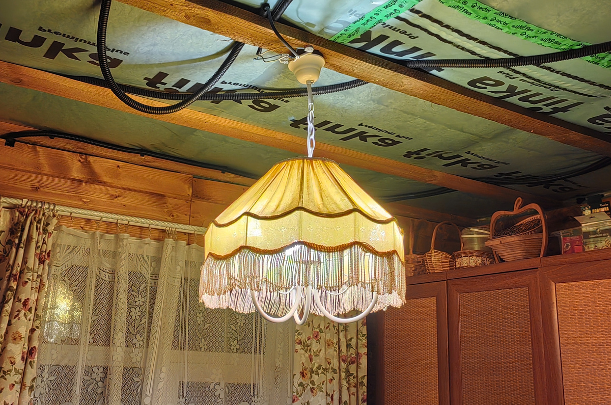 И вот с этой комнатой у меня было всё не то и не так. До тех пор, пока мы не поняли, что платяные шкафы из квартиры нужно именно сюда определить. Но с освещением – никак. Был у меня абажур старый, тканевый. Но всё как-то не получалось его к делу приспособить: что-то мешало.