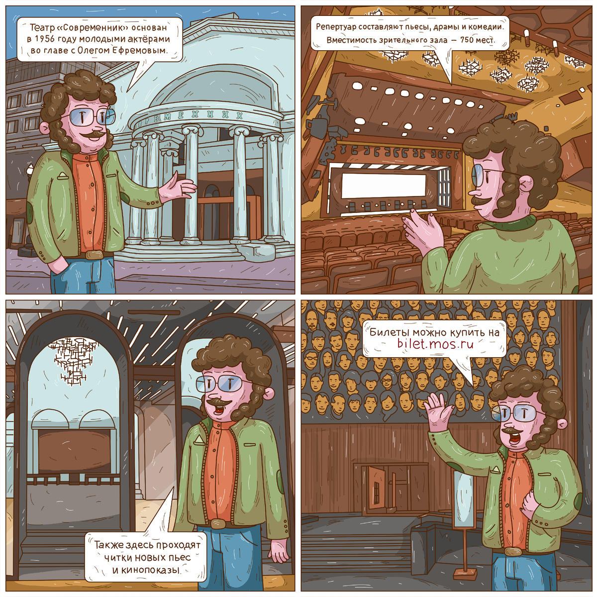 * «Современник» был создан в 1956 году группой молодых выпускников Школы-студии МХАТ, возглавляемой Олегом Ефремовым. Это был первый в СССР театр, основанный не «сверху» по приказу государства, а «снизу» по инициативе актеров. Он стал символом хрущевской «оттепели» и глотком свежего воздуха после сталинской эпохи. ** В 1970 году основатель театра Олег Ефремов неожиданно принял предложение возглавить «больной» МХАТ и ушел из «Современника», взяв с собой нескольких ведущих актеров. Казалось, театр был на грани краха. Однако труппа избрала новым художественным руководителем Галину Волчек, которая возглавляла театр почти 50 лет (с 1972 по 2019 год) и сумела не просто сохранить, но и преумножить его славу. *** С 1974 года «Современник» располагается в здании на Чистых прудах, которое изначально было построено в 1914 году как кинотеатр «Колизей». Позже он был перестроен в театр, но исторические черты, включая знаменитый колонный портик, сохранились. ****