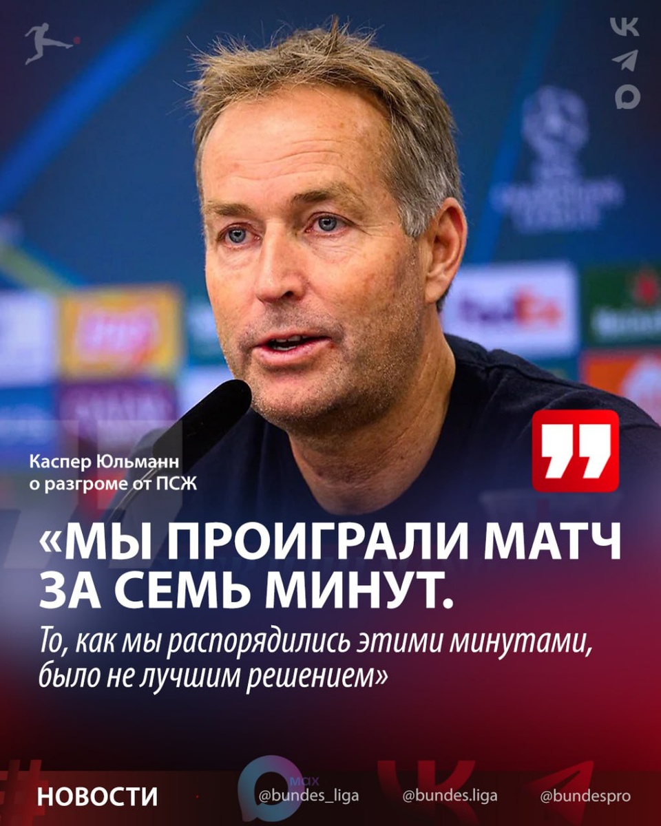 🔥 «Байер» играл по схеме, которую команда не отрабатывала. «Байер 04» потерпел первое поражение под руководством Каспера Юльманна проиграв «Пари Сен-Жермен» со счётом 2:7. При счёте 1:1 датский тренер проанализировал семиминутный отрезок, в котором команда упустила преимущество. 💬 «Мы проиграли матч за семь минут. Может быть, мы всё равно бы проиграли. Но то, как мы распорядились этими минутами, было не лучшим решением». Но, несмотря на тяжёлое поражение, Юльманн защищал своих игроков, отмечая, что «Байер» играл по схеме, которую они не отрабатывали. Он имеет в виду схему 4-4-1, которая была введена после удаления Роберта Андриха на 33-й минуте. ⭐️ MAX /// Видео+ ❤ Телеграм /// Аналитика+ ✅️ Флагманская /// Новости+