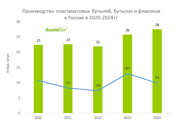 В 2020-2024 гг производство пластмассовых бутылей, бутылок и флаконов в России увеличилось на 23%: с 23 до 28 млрд шт.