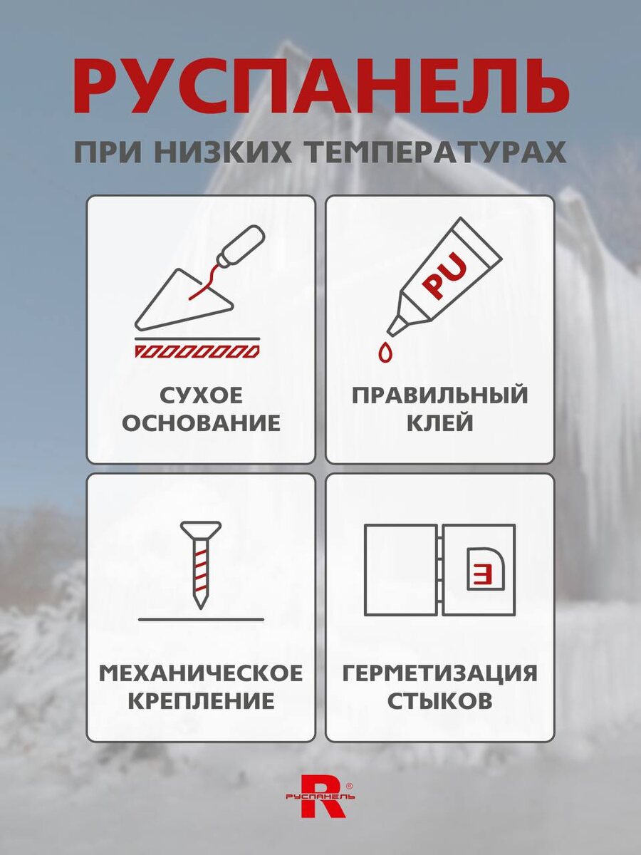 ❄️ «Руспанель» при низких температурах: что важно учитывать Монтаж панелей «Руспанель» возможен круглый год, но при работе в условиях пониженных температур необходимо соблюдать ряд правил: 1️⃣ Выбор клея. Для крепления используйте полиуретановый клей RUSPANEL или плиточный клей KR-Универсал при закреплении на кирпич и бетон. Они сохраняют адгезию даже при минусовых температурах. Важно: не применять ацетоносодержащие составы. 2️⃣ Комбинированное крепление. Не забывайте дополнительно фиксировать панели механически: саморезами через пресс-шайбу или дюбелями. Это исключает смещение до полного схватывания клея. 3️⃣ Подготовка основания. Основание должно быть сухим и очищенным от наледи, пыли и грязи. На промерзшие или влажные поверхности клей не будет работать должным образом. 4️⃣ Стыки и гидроизоляция стыков. Обращаем внимание, что гидроизоляция проводится только на стыках панелей (при этом стыки тоже проклеиваются). В случаях, когда планируется постоянный контакт с водой, необходимо
