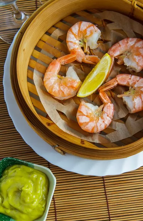 4. Вскипятите рассол от креветок в воке или кастрюле — использование этой жидкости вместо воды усилит вкус. Готовьте креветки в пароварке 4-5 минут. Для соуса заранее приготовьте майонез: