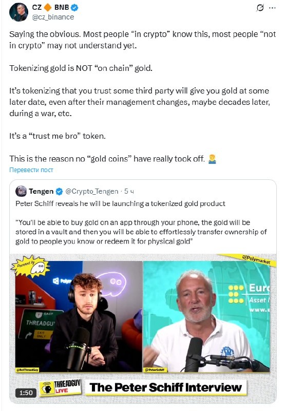 Констатирую очевидное. Большинство людей «в крипто» это знают, большинство «не в крипто» — возможно, ещё нет. Токенизация золота — это НЕ «ончейн-золото». Это токенизация вашего доверия к тому, что какая-то третья сторона выдаст вам золото в будущем — даже после смены руководства, возможно, спустя десятилетия, во время войны и так далее. По сути, это токен-обещание «поверь мне, братан». Именно поэтому ни одна «золотая монета» по-настоящему не взлетела.