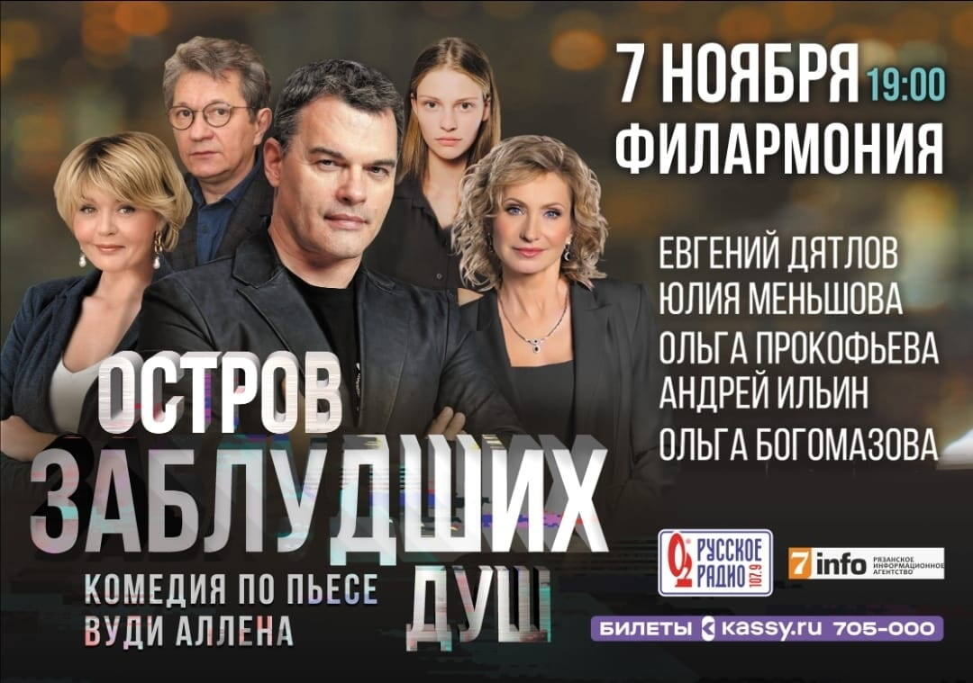 7info дарит рязанским зрителям шанс попасть на спектакль «Остров заблудших душ» с звездами российского кино и театра. Спектакль «Остров заблудших душ» (16+) по пьесе Вуди Аллена — это камерная история, буквально пронизанная тонким юмором и начинённая философским подтекстом. В его основе — классический любовный треугольник. Ох, сколько пар разрушила эта роковая геометрическая фигура! Но в этой истории треугольник неожиданно дополняется ещё одним углом… Интрига, да и только! Сыграет эту запутанную историю на сцене Филармонии блестящий состав артистов: Юлия Меньшова, Евгений Дятлов, Ольга Прокофьева, Андрей Ильин и Ольга Богомазова. Розыгрыш проводим в нашей группе ВКонтакте, а также в телеграм-канале. Если вы не хотите испытывать судьбу, билеты на спектакль «Остров заблудших душ» еще можно приобрести на сайте.