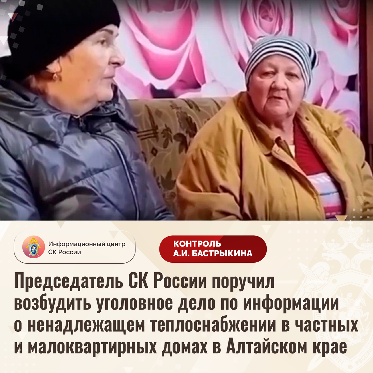 Председатель СК России поручил возбудить уголовное дело по информации о ненадлежащем теплоснабжении в частных и малоквартирных домах в Алтайском крае В социальной сети сообщается о ненадлежащем теплоснабжении в восьми частных и малоквартирных домах на улице Южной в поселке Заветы Ильича Алтайского края. В связи с технологическими ошибками, допущенными при ремонте участка трубопровода, на протяжении трех лет подача коммунального ресурса в жилые помещения осуществляется с постоянными перебоями. Несмотря на начало отопительного сезона в сентябре текущего года, теплоноситель в жилье не поступает. Граждане, среди которых пенсионеры, вынуждены круглосуточно находиться в помещениях в верхней одежде. Обращения в различные инстанции результатов не принесли. В СУ СК России по Алтайскому краю организована процессуальная проверка. Председатель Следственного комитета Российской Федерации Александр Иванович Бастрыкин поручил руководителю СУ СК России по Алтайскому краю Игорю Владимировичу Колесниче