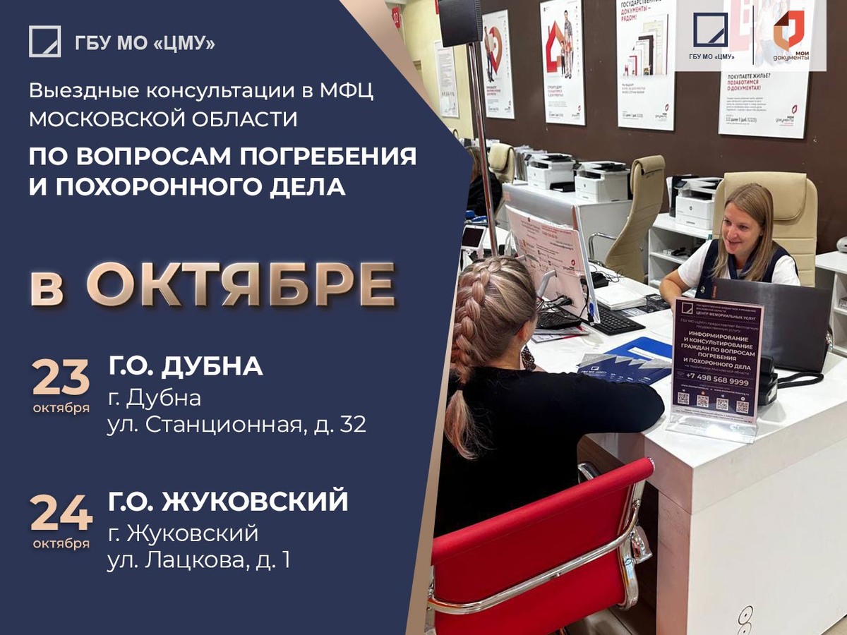 Уважаемые жители Московской области. Приходите в МФЦ вашего города на выездные консультации экспертов по вопросам в сфере погребения и похоронного дела, которые состоятся: 23.10.2025 МФЦ, Московская обл., г.о. Дубна, г. Дубна, ул. Станционная, д. 32 24.10.2025 МФЦ, Московская обл., г.о. Жуковский, г. Жуковский,