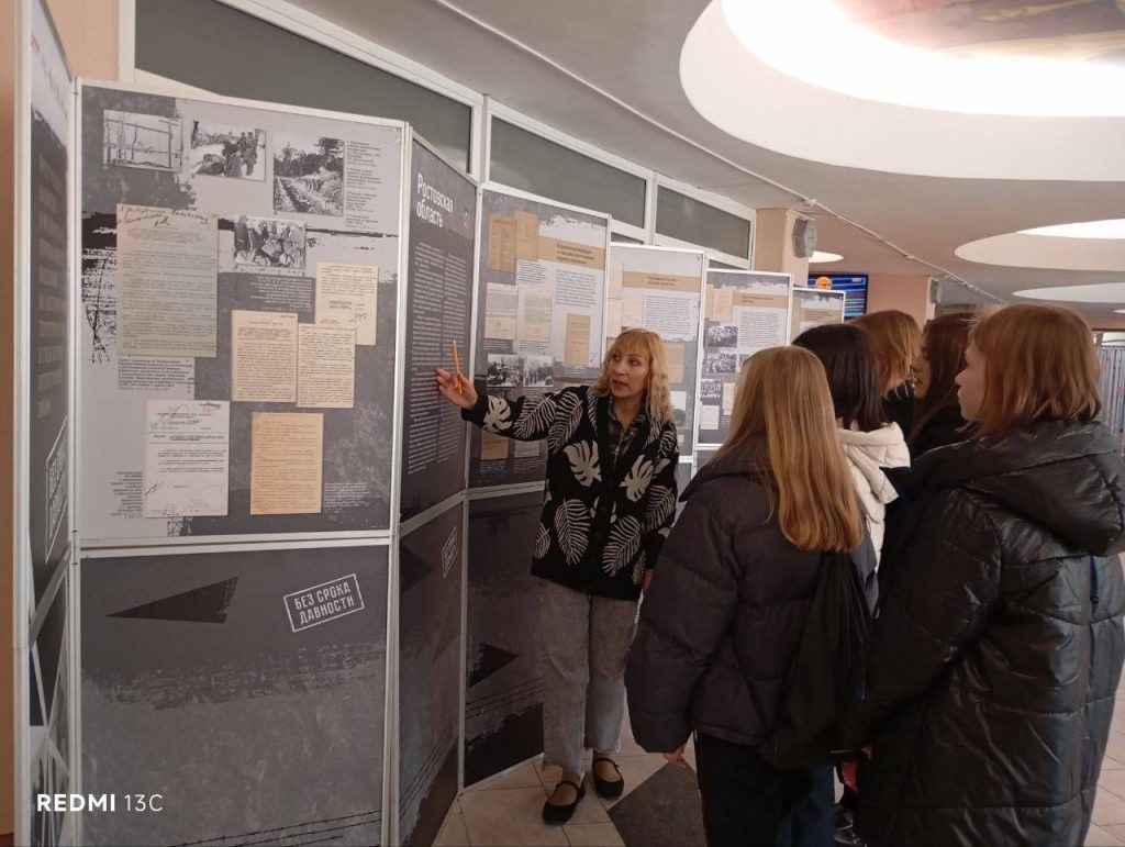 Методисты ГКДЦ подготовили для учащихся школ тематическую экскурсию по выставке , посвященной преступлениям против мирного населения Ростовской области в годы Великой Отечественной войны. Мероприятие проводится в рамках федеральной программы «Без срока давности». Выставка служит своеобразным мостиком между прошлым и настоящим, показывая молодёжи всю тяжесть испытаний, выпавших на долю соотечественников в тяжелые времена оккупации. Каждое представленное свидетельство подчёркивает цену, уплаченную страной за освобождение и победу. Эта выставка – дань памяти жертвам жестокости и напоминание о том, какой ценой была завоевана Победа. Важно, чтобы молодое поколение знало и помнило об этих страшных событиях. Проект «Без срока давности» призван сохранить историческую правду и передать ее будущим поколениям, чтобы подобные трагедии никогда не повторились. Фото ГКДЦ