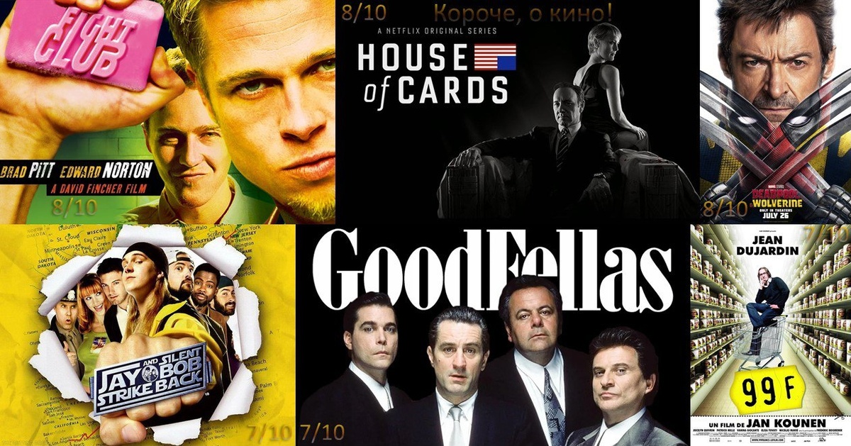 Фильмы с тремя стенами Вне рейтинга: Дэдпул/Deadpool 2016 Моя оценка: 8 из 10 Оценка на КП/IMDb: 7.6/8.0 Дэдпул 2/Deadpool 2 2018 Моя оценка: 8 из 10 Оценка на КП/IMDb: 7.4/7,6 Дэдпул и Росомаха/Deadpool & Wolverine 2024 Моя оценка: 8 из 10 Оценка на КП/IMDb: 7.6/8,0 История антигероя Marvel, пережившего эксперимент, получившего суперспособности, потерявшего адекватность, но не чувство юмора. Рейтинг: 1. Бойцовский клуб/Fight Club 1999 Моя оценка: 8 из 10 Оценка на КП/IMDb: 8.7/8.8 История офисного работника, ищущего лекарство от бессонницы, которому помогает лишь подпольный бойцовский клуб, со временем превращающийся в нечто большее. 2. Карточный домик/House of Cards 2013–2018 Моя оценка: 8 из 10 Оценка на КП/IMDb: 8.3/8.6 Политический триллер о безжалостном конгрессмене, готовом на всё ради власти. 3. Джей и Молчаливый Боб наносят ответный удар/Jay and Silent Bob Reboot 2019 Моя оценка: 7 из 10 Оценка на КП/IMDb: 7.2/6.8 Приключение двух друзей, отправившихся в Голливуд за прич