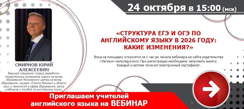 Вебинар "Структура ЕГЭ и ОГЭ по английскому языку в 2026 году: какие изменения?" Дата: 24.10.2025 (Пт) Время: 15:00 Лектор Смирнов Юрий Алексеевич - ведущий специалист ГАОУ ДПО «Московский центр качества образования» (МЦКО), лауреат «Гранта Москвы» в области наук и технологий в сфере образования, автор учебников и пособий по английскому языку. Участие бесплатное. Требуется регистрация на сайте издательства