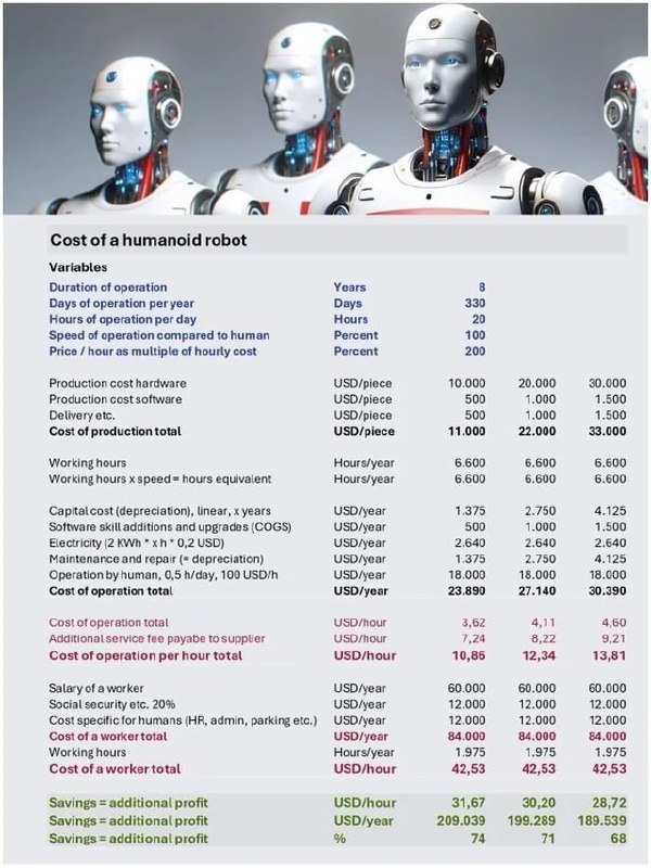 🤨К 2035 году час работы робота-гуманоида может стоить менее 1 доллара. Но даже при ставке 14 долларов/час финансовое преимущество по сравнению с человеческим трудом приближается к 200 000 долларов на робота в год. Для сравнения, час работы квалифицированного рабочего при полной загрузке стоит $42,5 #AI #ИИ #Нейросеть
