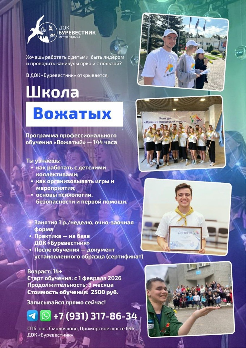 🔥 Школа вожатых от ДОК «Буревестник» Мы рады анонсировать для вас наше новое направление работы — подготовку педагогических кадров на базе нашего лагеря. Мы открываем запись на первый поток обучения нашей Школы вожатых! — Программа профессионального обучения «Вожатый» — 144 часа — Возраст: 14+ — Старт обучения: с 1 февраля 2026 года — Занятия 1 раз в неделю, очно-заочная форма — Продолжительность: 3 месяца — Стоимость обучения: 2500 руб. — Практика — на базе ДОК «Буревестник» — После обучения — документ установленного образца (сертификат) Подробности можно узнать на сайте, записаться можно по телефону: 📞 +7 (931) 317-86-34 📝 Записывайся прямо сейчас!