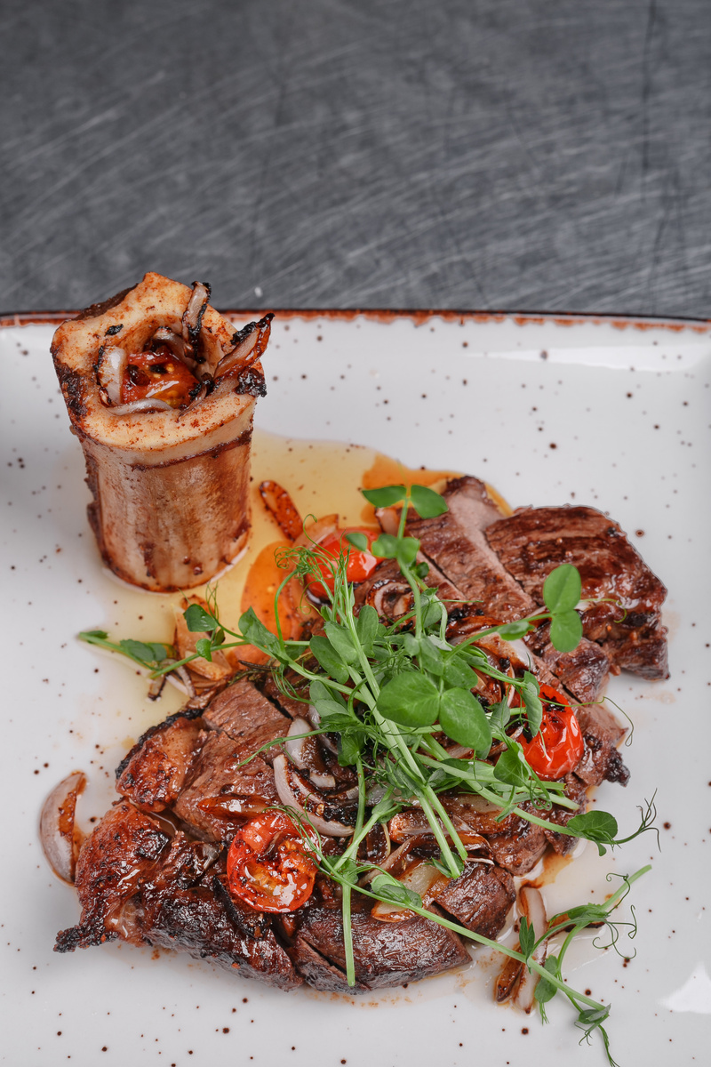 Лук нарежьте соломкой, помидоры — дольками (черри разрежьте пополам). Когда стейк почти готов, положите на сковороду мозговую косточку — обжарьте и отправьте в духовку на 4–5 минут при 140°C. Готовый стейк переложите на деревянную доску и дайте ему «отдохнуть» 2–3 минуты.