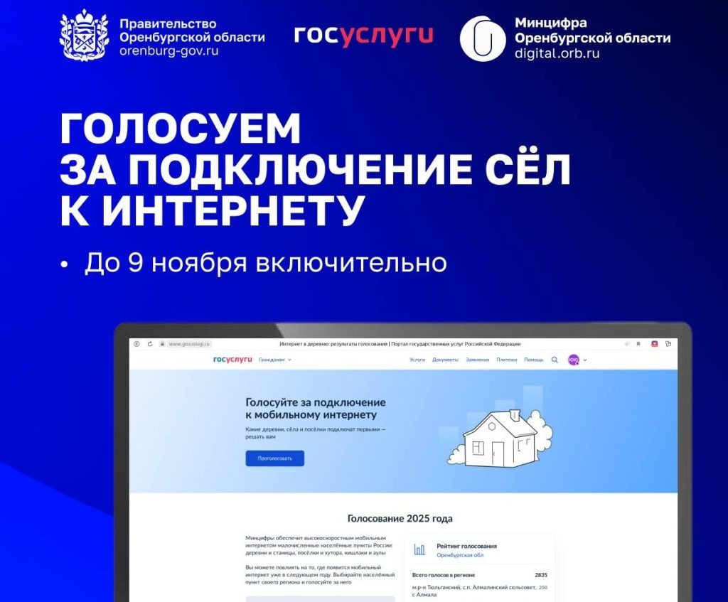 Какие именно села попадут в счастливый список, определят сами жители. Голосование за малочисленные села, в которых в 2026 году появится мобильный интернет, пройдет до 9 ноября. За последние четыре года интернет появился в 183 оренбургских селах, за которые проголосовали почти 70 тысяч оренбуржцев. Каждый житель старше 18 лет может проголосовать за один населенный пункт. Проголосовать можно онлайн на «Госуслугах» — после авторизации ввести в окно название села из списка и отдать голос. Также можно отправить письмо в Минцифры России почтой по адресу: 123112, Москва, Пресненская наб., д. 10, стр. 2. Подписать письмо могут несколько человек – будет учтен каждый голос. Пример письма здесь. Фото: пул56 16+