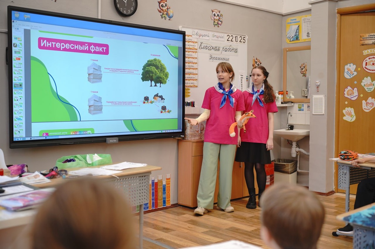 🌍 Эко-уроки «С добром к планете» Всю неделю волонтёры из Добровольческого центра «ДШУ-1474» проводят увлекательные эко-уроки для младших школьников! ♻️ Короткие, но яркие занятия (всего 5–6 минут) рассказывают ребятам о волшебном мире переработки мусора и правильном раздельном сборе отходов. Особенно интересно школьникам узнавать, как сдача макулатуры или крышечек помогают планете. Ведь каждый знает, как важно заботиться об окружающей среде! 🌳 Интересный факт: одна тонна переработанной бумаги спасает целых 17 деревьев! #ДОНМ #БезопаснаяСреда #Школа1474 #ДШУ1474 #МЦВП_С_добром_к_планете
