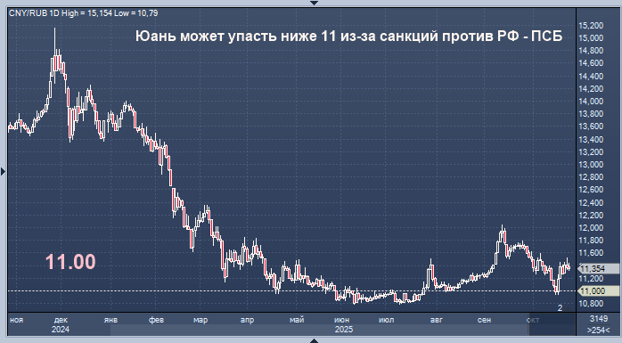 Риски ухода рубля "под" отметку 11 руб./юань ближе к концу октября возросли - ПСБ Курс доллара к рублю расчётный, фьючерс, вечный фьючерс и межбанк. Курс евро к рублю расчётный, фьючерс, вечный фьючерс и межбанк. Курс юаня к рублю биржевой, фьючерс, вечный фьючерс и межбанк. Риски ухода курса валютной пары юань/рубль "под" отметку 11 рублей за юань ближе к концу текущего месяца возросли, считает начальник отдела экономического и отраслевого анализа банка ПСБ Евгений Локтюхов. "Отметим, что, наряду с новым пакетом санкций, в пользу укрепления рубля может сыграть планируемое с 21 ноября введение США санкций против "Роснефти" и "ЛУКОЙЛа", способное дополнительно усилить предложение валюты со стороны экспортеров в начинающийся период подготовки к налоговым выплатам, - пишет эксперт в комментарии. - На фоне новых геовводных ждем повышения волатильности на валютном рынке. Причем видим риск теста курсом юаня нижней границы нашего текущего целевого диапазона 11-11,5 рубля за юань в конце месяц