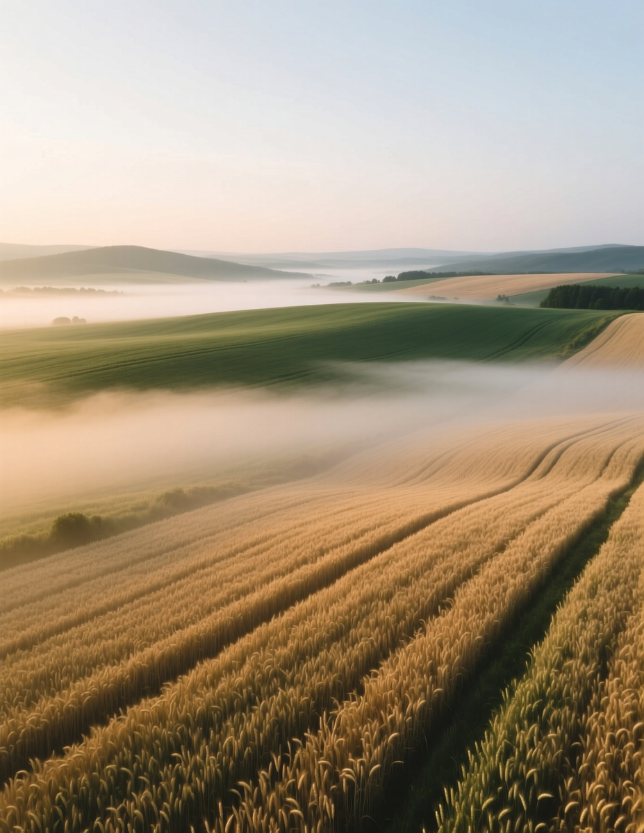 Позиционирование: «Технологии в служении природе». Ответы на ключевые вопросы: 💡 Цель: не «деревня», а точное, уважительное, технологичное земледелие. Дрон над золотистым полем пшеницы на рассвете, мягкий туман внизу, горизонт чёткий, палитра: глубокий зелёный #4A5D43, пыльный беж #D9D2C7, тёплый графит #2E2E2E, фотореализм с лёгкой зернистостью, композиция — широкий план с пустым пространством сверху, настроение — масштаб, забота, точность, без текста, 4K Минималистичная визитка на фоне сухой соломы, фон — пыльный беж #D9D2C7, надписи тёплым графитом #2E2E2E шрифт