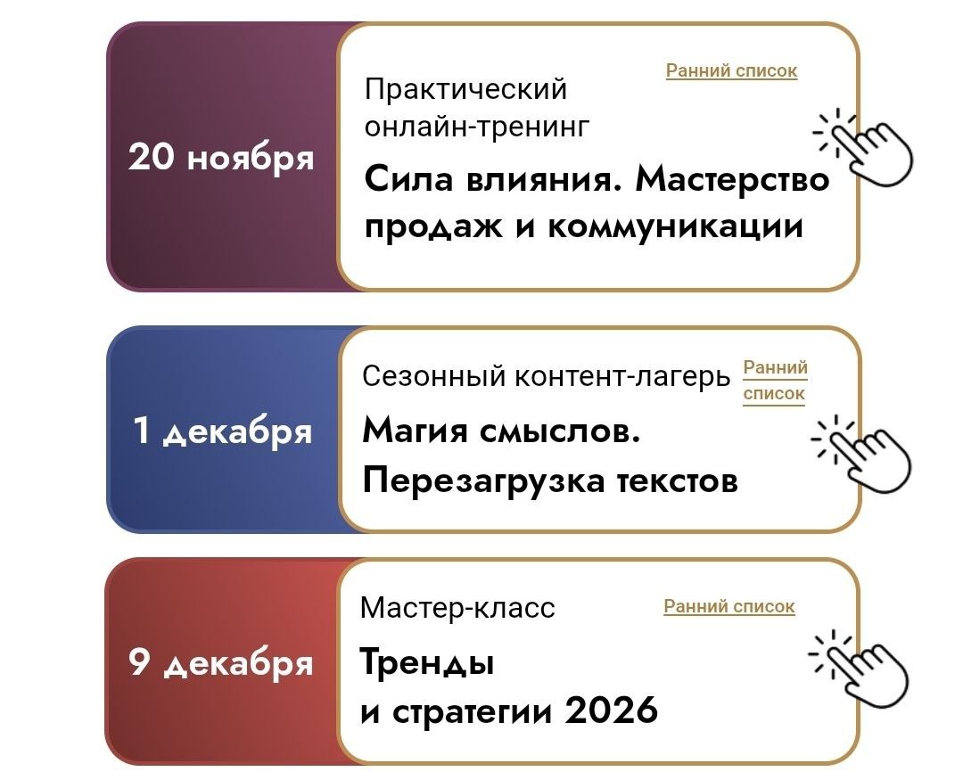 Расписание ноября и декабря 🚀 Завершим рабочий год ударно) 20 ноября - тренинг "Сила влияния. Мастерство продаж и коммуникации" Однозначный победитель в голосовании наших выпускников на тему "Что вы хотите увидеть от нас дальше" + примерно год я думала о тренинге на эту тему и вот наконец - будет! Микс коммуникационных скиллов и твёрдых продающих техник = продажи без сопротивления. Когда клиенту комфортно, а вам спокойно. Пойдём в психотехнологии продаж, будем учиться общаться с людьми, понимать, что стоит за их словами, находить "ключик" к каждому, мягко работать с возражениями... И делать так, чтобы любая продажа происходила максимально естественно - как продолжение доверительного общения ❤️ »»» Записаться в лист ожидания 1 декабря - зимний контент-лагерь "Магия Смыслов. Перезагрузка текстов". Наш хит, запустим уже 5-й поток. Внедряем привычку писать классные, сочные тексты, пробирающие до мурашек триггерными смыслами и ставим навык создания регулярного продающего контента