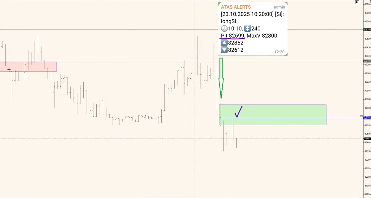 А это отработка усилия по Си. Усилие было покупателя, антиакцепт, тест ровно по Pit (опять повезло😀) и продолжение движения на шорт.