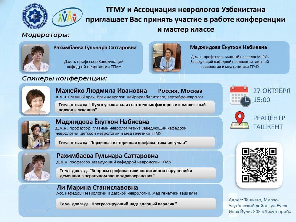 #вебинар 💫Международный научный вебинар 🩺 «Инновационные подходы в современной детской неврологии и реабилитации» Ташкентский государственный медицинский университет совместно с ООО «Центр детской реабилитации» (г. Москва) проводит международный научный вебинар. 🔹 Спикер: Кандидат медицинских наук, врач-невролог, детский травматолог-ортопед, вертеброневролог, создатель первой в России клиники ортопедической неврологии, ведущий специалист клиники. Автор ряда патентов и книги «Новое решение неврологических проблем у детей», награждена Орденом Екатерины Великой Российской академией естествознания за служение науке и просвещению. 🔸 В 2011 году получила Свидетельство разработчика медицинской технологии от Международной академии фундаментального образования (Санкт-Петербург). 📅 Дата: 27 октября 2025 года 🕓 Время: 15:00 (по ташкентскому времени) 💻 Формат: Онлайн,online (вебинар) 🎓 Участники: врачи, магистры и студенты. ✅Rasmiy sahifalarimiz: Telegram | Facebook | Instagram | You