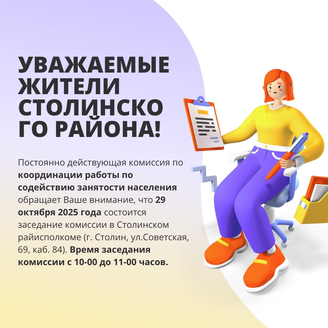 Уважаемые жители Столинского района! ▪️Постоянно действующая комиссия по координации работы по содействию занятости населения обращает Ваше внимание, что 29 октября 2025 года состоится заседание комиссии в Столинском райисполкоме (г. Столин, ул.Советская, 69, каб. 84). Время заседания комиссии с 10-00 до 11-00 часов. Каждый житель района, испытывающий трудности в поиске работы может обратиться в комиссию по вопросу содействия в трудоустройстве, обучения, самозанятости; в случае нахождения в трудной жизненной ситуации предоставив подтверждающие документы или получить консультативную помощь. Предварительная запись по тел. 2 83 43.
