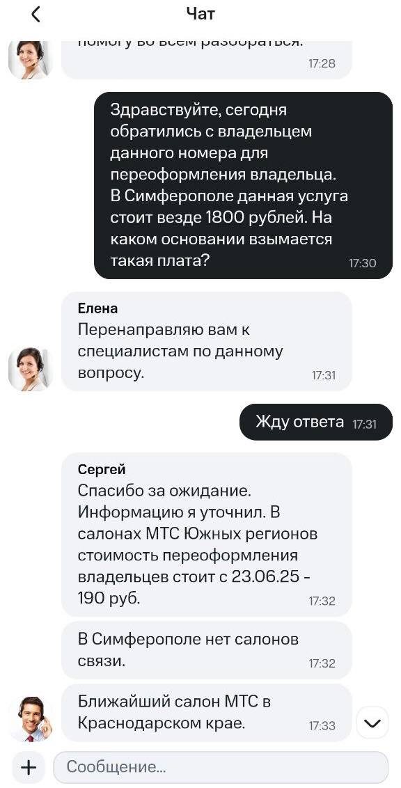 Всем известно, что по федеральному закону необходимо до 1 ноября 2025 года переоформить на себя свой номер телефона, если не являешься владельцем. Сегодня с мамой обратились в один из "салонов МТС" в Симферополе для проведения данной процедуры. Нам сказали, что так как в Крыму МТС не работает, то эта услуга будет стоить 1800 рублей. Я обратились в поддержку МТС за разъяснением, мне ответили: «ближайший офис в Краснодаре, стоимость 190 рублей». То есть, жители Крыма и Севастополя в данной ситуации должны заплатить практически в 10 раз больше… 👥Нам пишут ✈️Севастополь | Мы в MAX📲