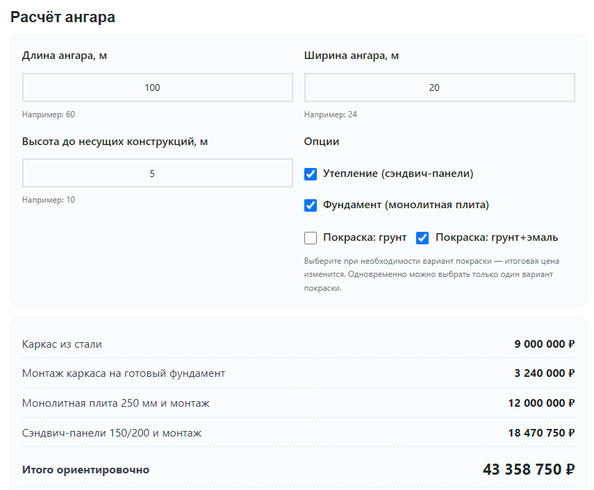 Все расчёты даны для ангара размером 100×20 метров, высотой до несущих конструкций 5 метров, с утеплением и монолитным фундаментом. Итого: 43 358 750 ₽