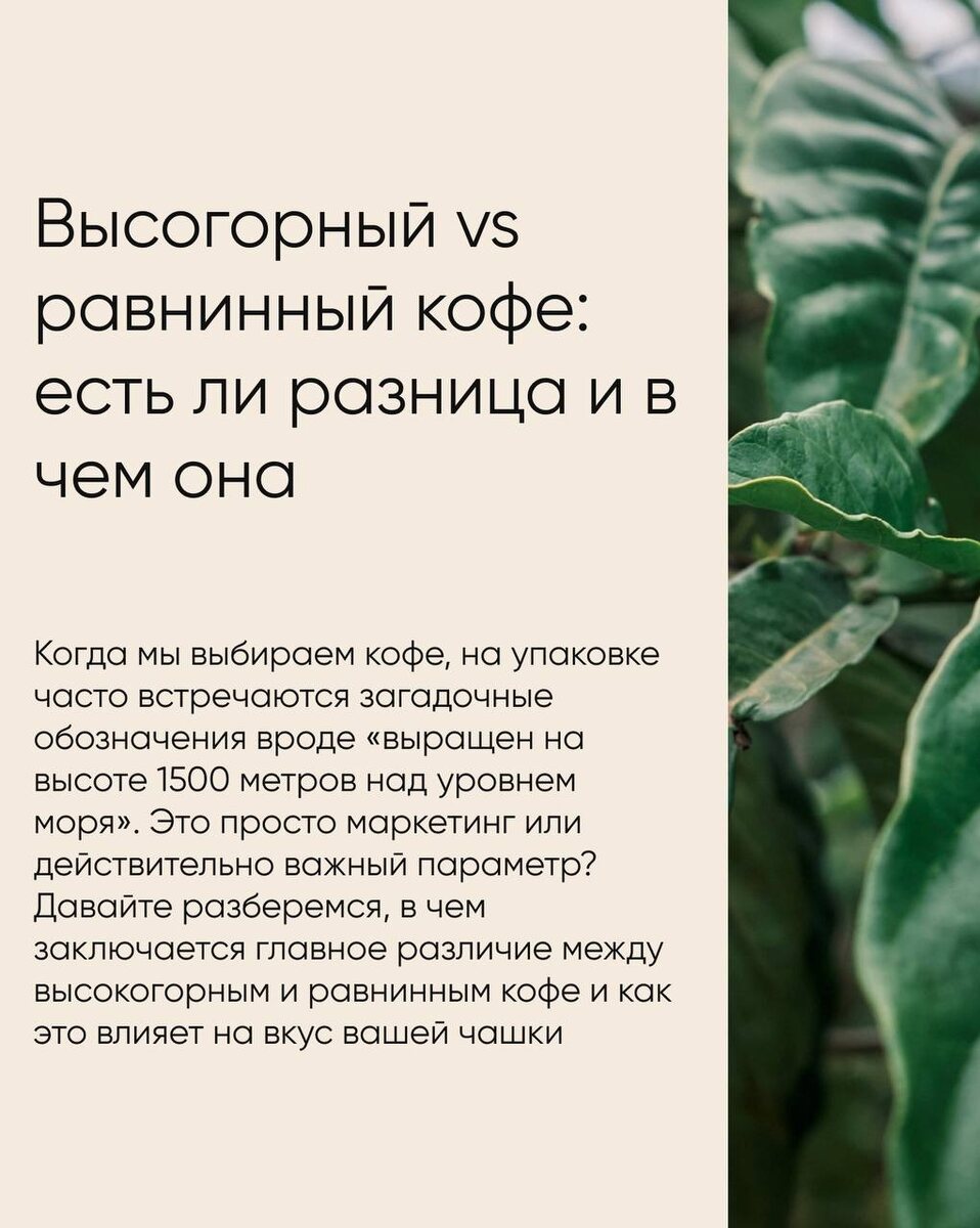 Высота выращивания кофе — не просто цифра на упаковке. 🌿 Это ключ к пониманию вкуса. Почему один кофе поражает яркой кислинкой и фруктовыми нотами, а другой — плотный и шоколадный? Всё решают метры над уровнем моря.🏔️