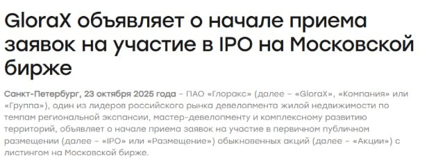 На рынке наконец-то оживление – после почти годовой паузы на Московской бирже стартовало первое IPO 2025 года. Свой выход на публичный рынок объявил GloraX, девелопер, который за последние годы из петербургского игрока превратился в федеральную компанию с проектами по всей России. Сектор недвижимости пережил непростые времена – высокая ставка, спад на льготной ипотеке, осторожность инвесторов. И, кажется, начинает оживать. Именно такие периоды часто становятся моментом входа для тех, кто верит в фундаментальные истории роста. GloraX – один из немногих девелоперов, который демонстрирует рост даже в таких условиях. Разберем более детально параметры выпуска: 👉Масштаб сделки и условия Компания планирует привлечь не менее 2 млрд рублей за счет дополнительной эмиссии (важно, что 100% cash-in). Средства направят на реализацию стратегии расширения в регионы, снижение долга и другие корпоративные цели. Цена размещения – 64 рубля за акцию, что соответствует мультипликатору P/E LTM 5,5x – уро