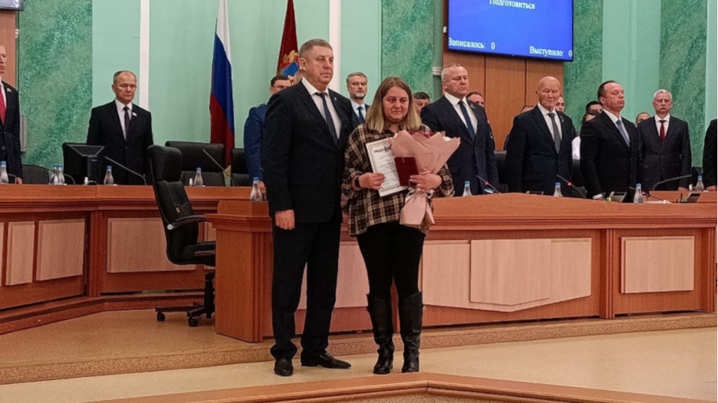 Октябрьская сессия Брянской областной Думы началась со скорбной и одновременно торжественной церемонии. Губернатор Александр Богомаз передал ордена Мужества родственникам погибших в СВО брянцев, награжденных ими посмертно. Александр Байдак, Александр Зубарь, Николай Король и Илья Сиваков пали смертью храбрых при выполнении боевых задач в ходе проведения специальной военной операции. Указ об их награждении подписал президент Владимир Путин. Об этом сообщил военный комиссар Брянской области Ильфат Абзалов. Заместителю председателя Брянской областной Думы Владимиру Пронину глава региона передал медалью «За храбрость» II степени. Ею был награжден, посмертно, погибший в СВО сын вице-спикера заксобрания - Игорь Пронин. Память погибших брянских героев почтили минутой молчания. ФОТО: «Брянская Губерния»/РИА Стрела Ордена Мужества четырех погибших в СВО брянцев торжественно передали их родным