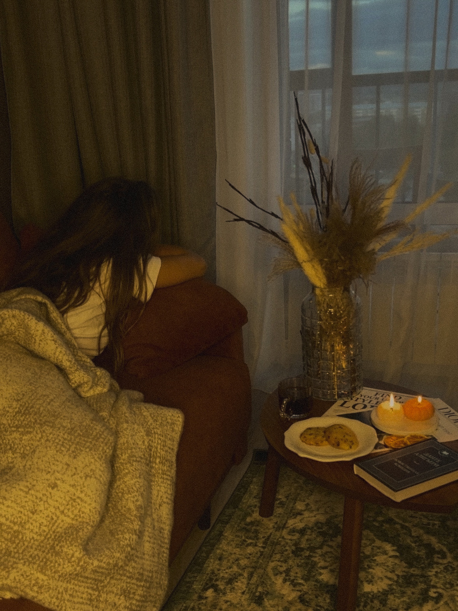 Добавь тёплые цвета: охру, терракоту, бордо или оливковый. Пара книг на прикроватной тумбочке или стопка журналов на кофейном столике создают атмосферу “медл