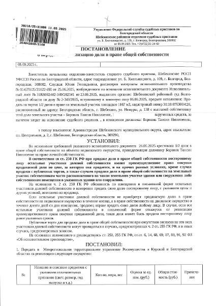 Название: 1/2 доля в праве общей долевой собственности на земельный участок площадью 1167 кв. м., кадастровый номер 31:18:0703004:26. Имущество обременено: арест, запрещение регистрации. Имущество принадлежит на праве собственности Боровик Т.Н. Основание реализации: постановление о передаче на реализацию доли в праве общей собственности от 08.09.2025 Шебекинское РОСП Канал: Госземля Белгородская область Область: обл Белгородская г. Шебекино Район: ул. Нежуры Населенный пункт: д. 138 Локация: Смотреть на карте ВРИ: Для индивидуального жилищного строительства Кадастровый номер: 31:18:0703004:26 Кадастровая стоимость: - Вид сделки: Продажа Площадь: 1167 м² Начальная цена: 536000.00 руб. Дата завершения: 24.11.2025 Подробнее: ГИС ТОРГИ #госземля #земляотгосударства #земля #земельныйучасток #земельныеторги #торги #аукцион #продажаземли #продажа #белгородскаяобласть