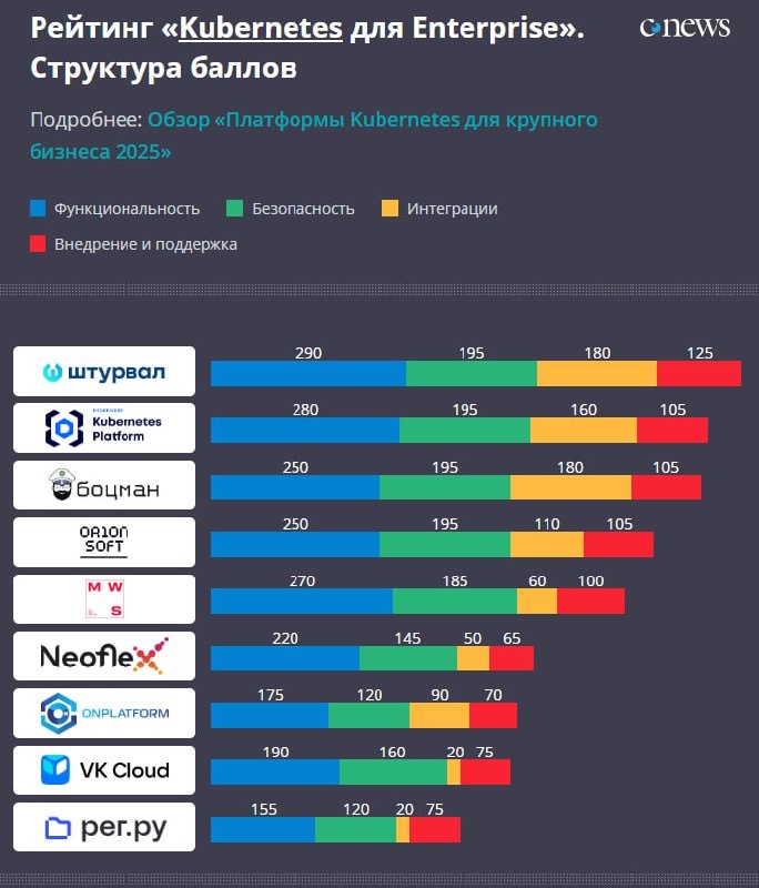 🚀 Топ-5 Kubernetes-платформ для крупного бизнеса в 2025 CNewsMarket представил первый в России рейтинг Enterprise-решений для оркестрации контейнеров. Крупным компаниям нужны не просто кластеры, а платформы с безопасностью, масштабируемостью и поддержкой «зоопарка» legacy- и cloud-native-приложений. 🏆 Лидеры рейтинга: 1️⃣ «Штурвал» (Лаборатория Числитель) — 790 баллов → Централизованное управление, изоляция, автоматическое масштабирование 2️⃣ Deckhouse Kubernetes Platform (Флант) — 740 → Работает везде: облака, bare metal, гибрид 3️⃣ «Боцман» (Группа Астра) — 730 → Фокус на кибербезопасность и высоконагруженные системы 📊 Оценка по 4 критериям: 🔹 Функциональность 🔹 Безопасность 🔹 Интеграции 🔹 Внедрение и поддержка Подробнее — в полном обзоре CNewsMarket. Ампилов про ИТ: https://dzen.ru/id/623d938f380f3715018b6e3c