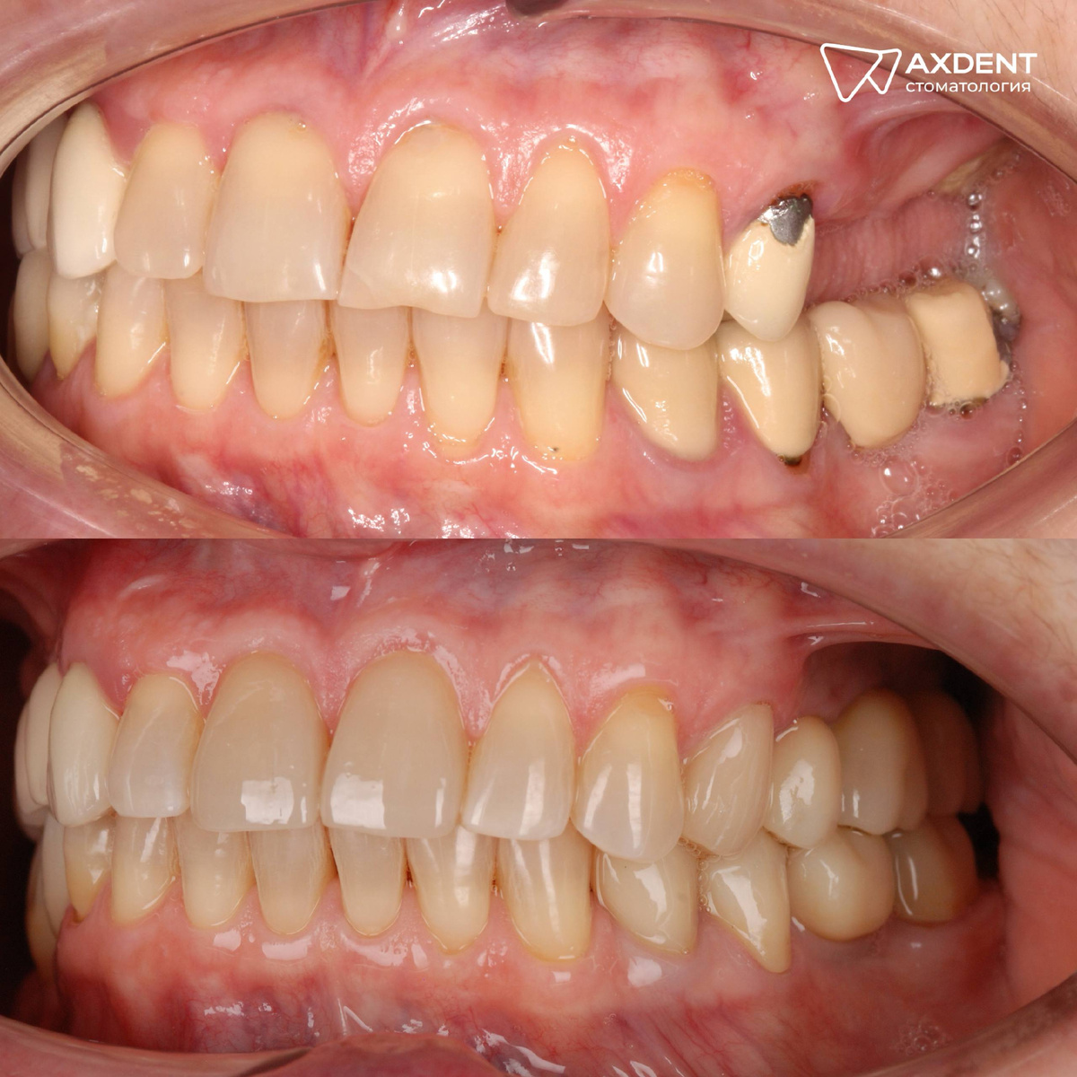 Пациентка пришёл заниматься зубами так, как ей позволяет её личная ситуация. И мы всегда разрабатываем тот план, который посилен, приемлем и оптимален для человека. Занимались зубами постепенно. Сразу обращу ваше внимание, мы понимаем, что при всех усилиях с точки зрения эстетики выделяется металлокерамический сегмент справа вверху. Надеемся и верим, что скоро пациентка найдет время заняться и им. Первый запрос пациентки - разрушилась левая сторона. “Ни жевать, ни улыбаться нормально не могу”, - дословно. Поэтому сначала мы установили имплантаты слева вверху, затем протезировали нижнюю часть. На это у нас ушло чуть больше полугода — с марта по январь мы успешно закрыли вопрос с жевательным отделом в этом сегменте рта. Цвет зубов у пациентки был довольно специфичным, но нам удалось идеально подобрать керамику по цвету для левой стороны. Затем мы обнаружили, что внизу с правой стороны в области одного из имплантов рассосалась кость, и шёл воспалительный процесс. Импланту не более 5 лет,