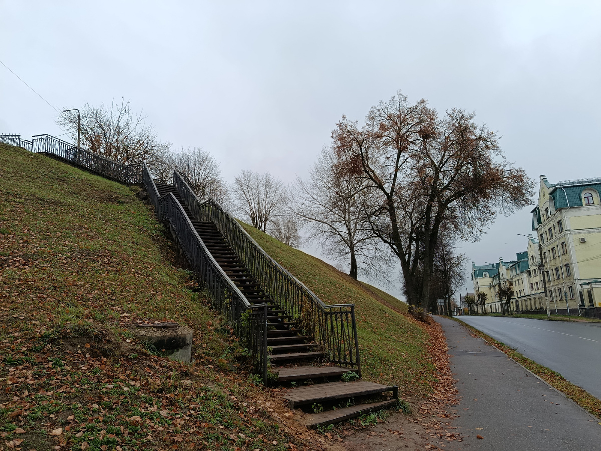 По этой лесенке-чудесенке иногда, когда иду от реки, я взлетаю к музею, где работаю. Весной вокруг расстилались сиреневые ковры хохлаток, летом волновалось то море одуванчиков, то короткошёрстный стриженый газон. Теперь вот.