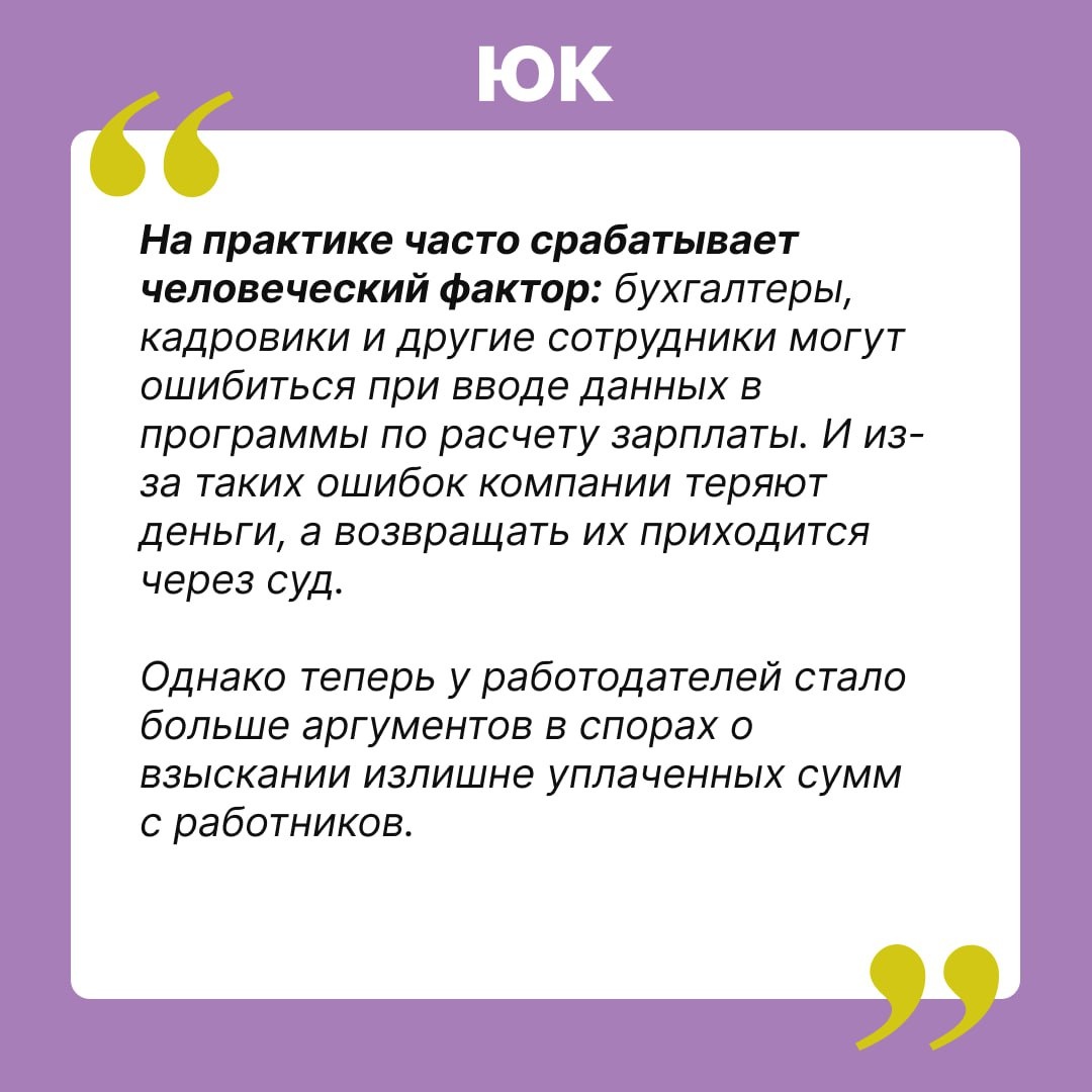 Компании смогут вернуть переплату зарплаты из-за ошибки при вводе данных в программу расчета зарплаты ➡️ Сотрудник получил зарплату почти 1,8 млн руб. вместо 10 тыс. за месяц. Причина: при расчете зарплаты бухгалтер не поставил запятую в количестве отработанных смен - указал 1064 смены вместо 10,64. Сотрудник деньги возвращать отказался. Первая инстанция и апелляция признали выплату результатом счетной ошибки и взыскали сумму как неосновательное обогащение. Кассация встала на сторону работника, посчитав, что бухгалтер допустила техническую, а не счетную ошибку, при вводе данных в зарплатную программу. 📌 Верховный суд не согласился с выводами кассации и оставил в силе решение первой инстанции и апелляции. Работник должен вернуть переплату работодателю. ВС разъяснил: неправильный ввод данных о количестве отработанных смен - это счетная ошибка, а не техническая. Счетной ошибкой считается арифметическая ошибка, допущенная при проведении расчетов сумм, подлежащих выплате, включая оши