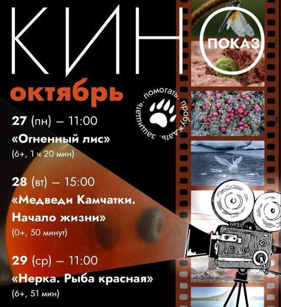 📌 Жителей Камчатки приглашают на кинопоказы от Кроноцкого заповедника На Камчатке в музее природы Кроноцкого заповедника возобновляются бесплатные показы фильмов о заповедной России, передает РАИ «КАМЧАТКА-ИНФОРМ». Как сообщают сотрудники заповедника, кинопоказы – это возможность почувствовать себя частью природы страны, проникнуться судьбой животных, обитающих на её просторах, и тех, кто их изучает и сохраняет. А в знаменитом художественном фильме «Земля Санникова» можно увидеть пейзажи Долины гейзеров и кальдеры вулкана Узон, какими они были в начале 1970-х. Проект призван показать людям уникальные экосистемы России и вдохновить их на бережное отношение к природе. На следующей неделе кинопоказы пройдут в Музее природы, который расположен в городе Елизово на улице Рябикова, 48. Расписание киносеансов: 27 октября (пн), 11.00: «Огненный лис» 28 октября (вт), 15.00: «Медведи Камчатки. Начало жизни» 29 октября (ср), 11.00: «Нерка. Рыба красная» 30 октября (чт), 15.00: «Земля Санн