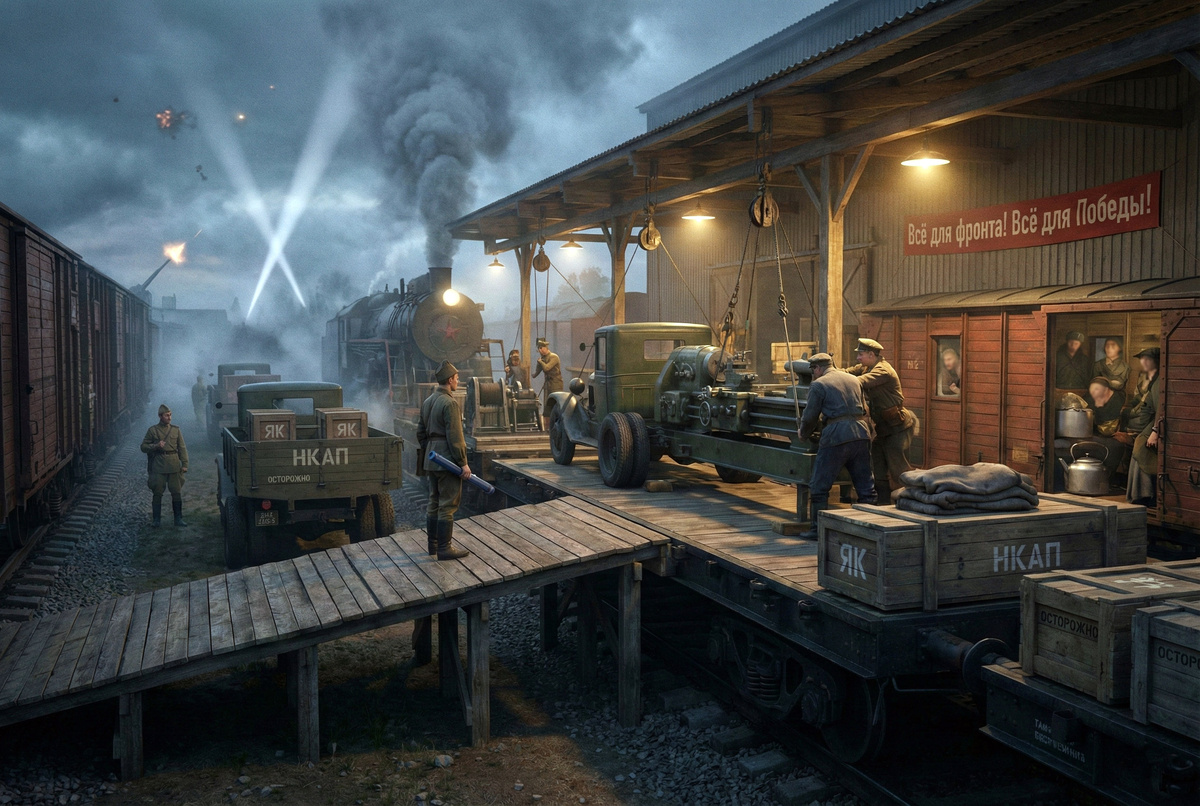 Эвакуация промышленности на время стала главным делом страны. Нужно было не только вывезти заводы, но и срочно создать на востоке базы, где могли бы работать люди и оборудование, чтобы не прекращался выпуск техники для фронта. Осенью 1941 года тысячи эшелонов с авиационными, танковыми, артиллерийскими и оружейными заводами потянулись за Волгу, на Урал и в Сибирь. От того, как быстро предприятия начнут работать, зависел успех армии. Наш завод, выпускавший истребители Як, направили в один из сибирских городов, где раньше делали сельхозмашины. Погрузка шла под налётами, при постоянных тревогах и взрывах, но ни на минуту не останавливалась. Завод продолжал выпуск самолётов до последнего дня, а готовые машины сразу передавали фронтовым лётчикам, которые нередко уходили на них прямо в бой. Все – от рабочих до конструкторов – трудились без отдыха, стараясь сохранить оборудование и материалы. Наркомат авиационной промышленности работал с колоссальным напряжением, ведь почти вся авиационная промышленность страны тогда была «на колёсах».