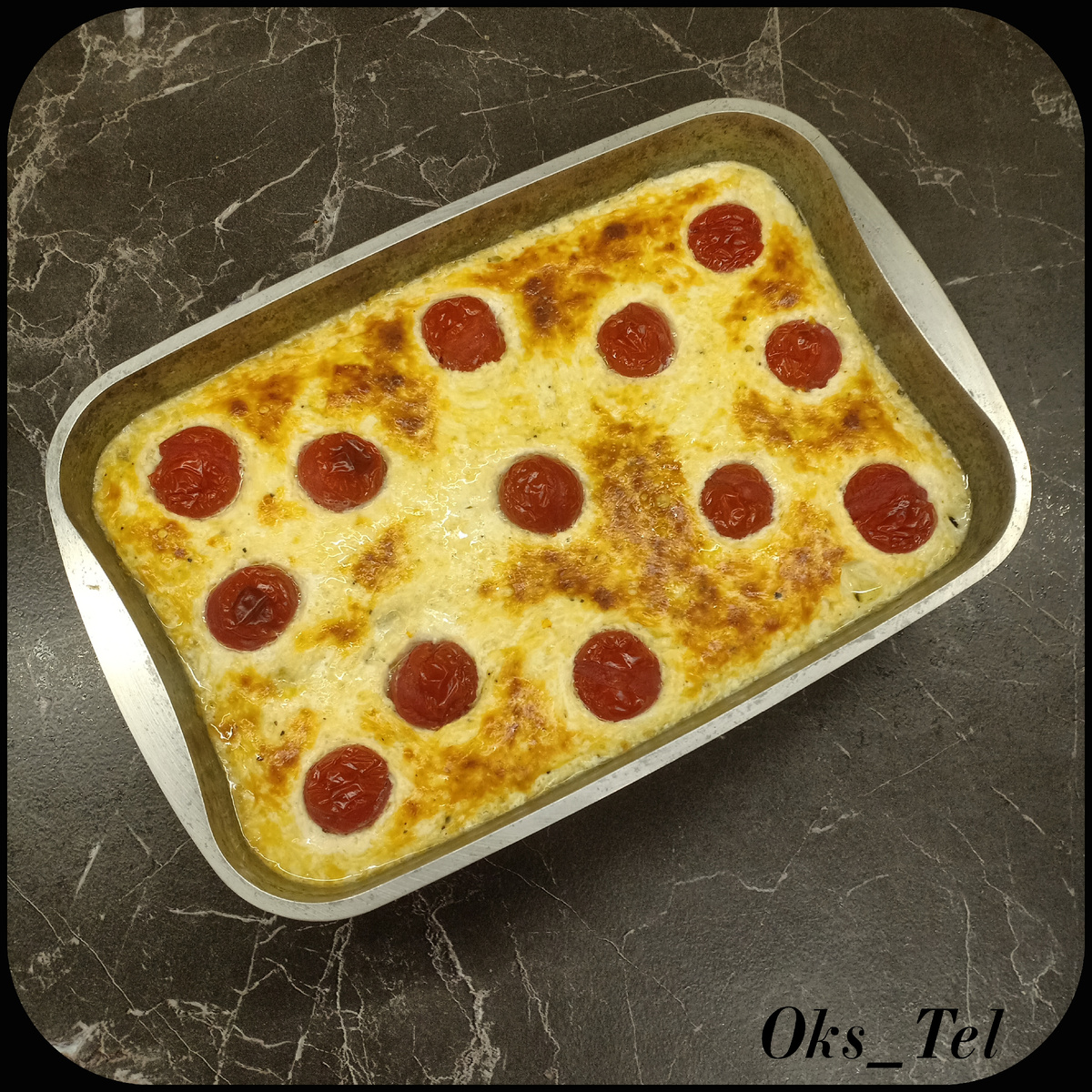 5. Получившейся заливкой равномерно залить филе, сверху разложить помидоры черри.