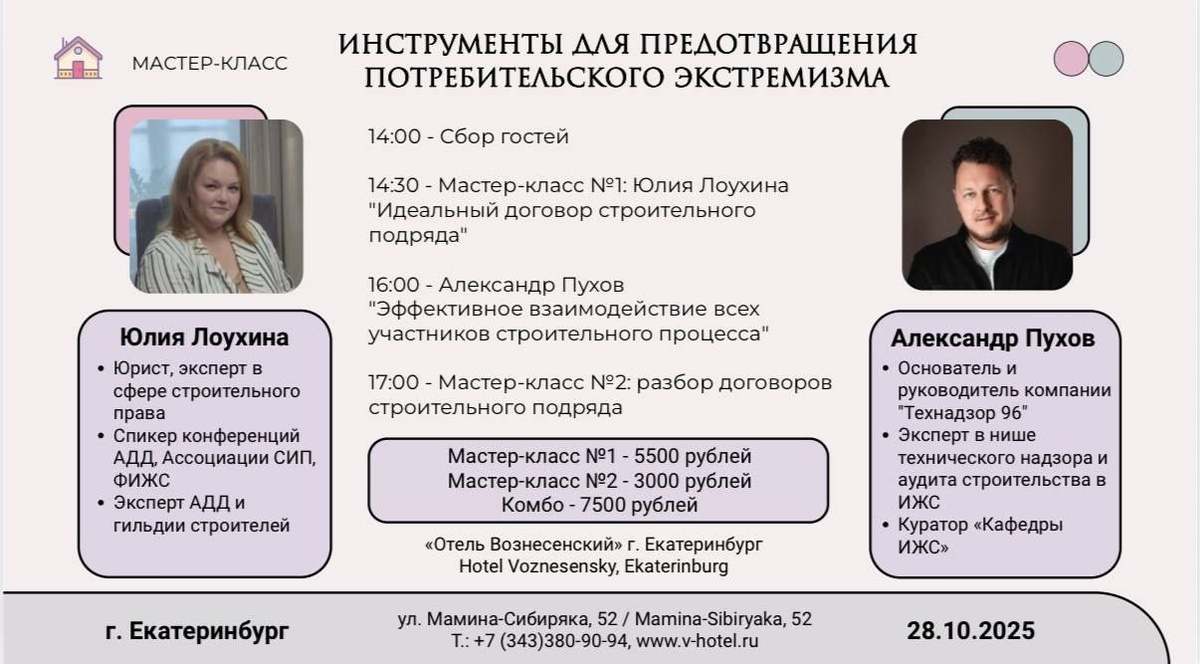 Строители Екатеринбурга, Урала и всея Руси! Внимание, внимание! Говорит и показывает Академия ИЖС! Наша декан факультета строительного права, та самая Лоухина (которая Юльсанна), самолично примчит в столицу Урала 28 октября. И не просто ж так примчит: а в компании с Александром Пуховым даст в отеле "Вознесенский" изумительный гастроль! Всем желающим не иметь судов с бессовестными заказчиками - на блюдечке с голубой каёмочкой поднесут, разжуют и скормят фишки и лайфхаки строительного договора, от корки до корки. А Александр Пухов пояснит авторитетно, как наладить дело так чтобы никто ни в какие суды и технадзоры не рыпался, а все работали как смазанные часики! Поэтому. Если строишь ИЖС, и картошку с маслом ешь - Быстро вписывайся в тусу. Вот те ссылка на всю плешь: https://loukhina.timepad.ru/event/3634073/ Быстро "Комбо" покупай, В первый ряд места хватай. И бери с собой жену, - Не бросай её одну. Пусть узнает, как мы строим По закону всю страну. Раунд.