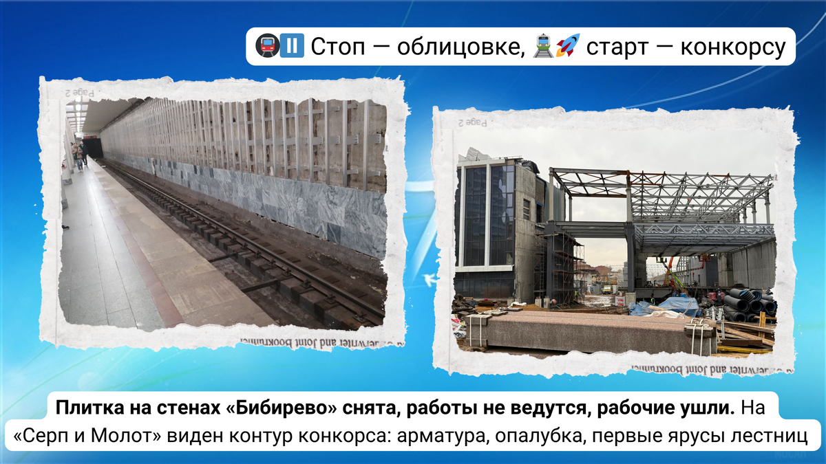 официальные отчеты. Давайте вместе разберемся, что же на самом деле происходит с нашей Москвой. Поехали? Во-первых, спешим сообщить, что работы по обновлению облицовки путевых стен на 🚇 станции «Бибирево» Серпуховско-Тимирязевской линии фактически приостановлены. Во-вторых, покажем продолжающееся строительство конкорса 🚊 станции «Серп и Молот» МЦД-2, МЦД-4 📷 2.1-2.2: Продолжаются работы по конкорсу в объеме первых двух платформ. 📷 2.3-2.4: У выхода к метро ведется благоустройство. ------------------