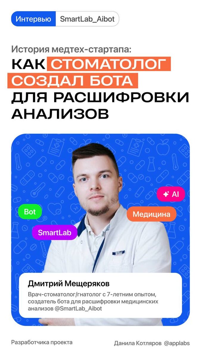 💊 Как стоматолог создал бота для расшифровки анализов Мы решили запустить новый формат — #Интервью Первым специалистом, с кем мы пообщались, стал стоматолог Дмитрий Мещеряков. Вместе с разработчиком Данилой Котляровым они придумали и создали проект, который помогает понять анализы без участия врача Это бот 👩🔬 СмартЛаб — он делает вопросы здоровья понятными и доступными каждому в любой момент времени