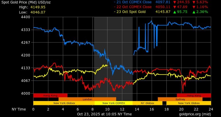 🔸23 октября спотовая цена на золото коснулась отметки в $4150 за унцию, увеличившись на 1,27% за день.
