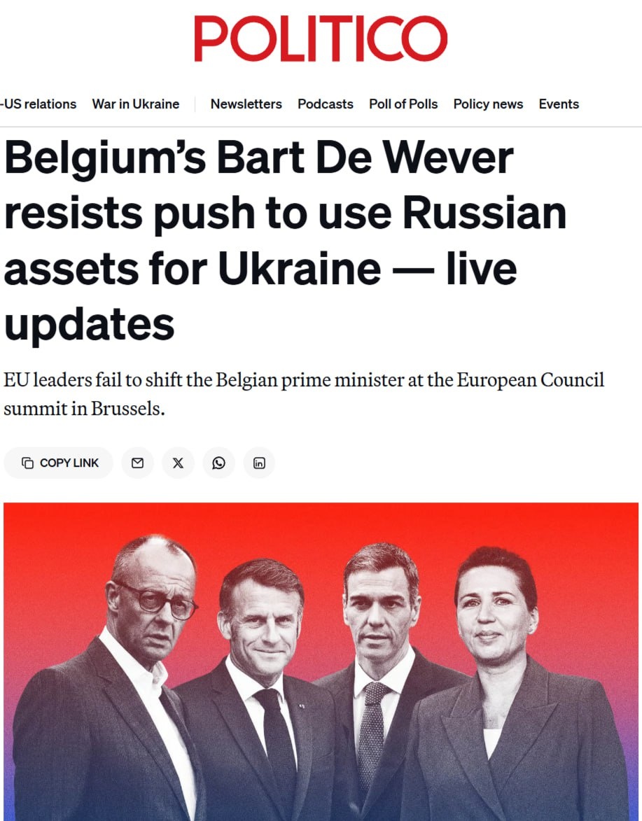 Заглавная страница европейского отдела журнала Politico: «Барт Де Вевер из Бельгии сопротивляется попыткам использовать российские активы для Украины»