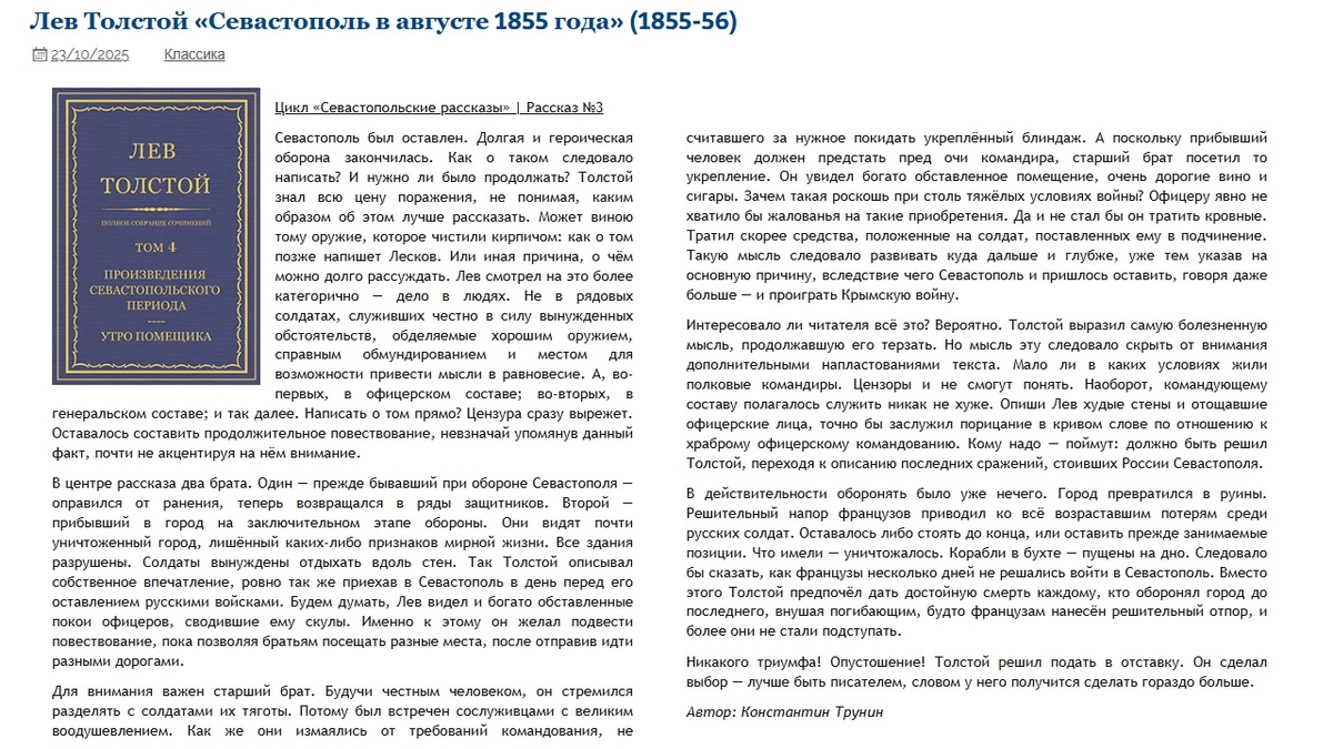Лев Толстой «Севастополь в августе 1855 года» Критика