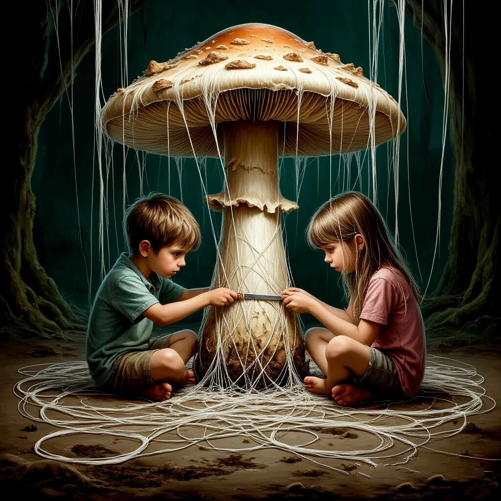 Картина, представшая перед ними, была жуткой; мальчик и девочка, опутанные белыми нитями, сидели на сгнившем полу, а посередине стоял большой склизкий и противный гриб, к которому тянулись эти нити.