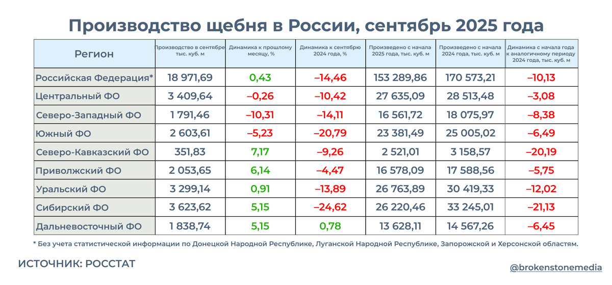 Росстат опубликовал данные по производству щебня в сентябре 2025 года. За месяц в России получено 19 млн куб. м (26,6 млн тонн). По отношению к сентябрю 2024 года производство щебня в стране снизилось на 14,5%. Относительно аналогичного периода прошлого года положительную динамику показал только Дальневосточный федеральный округ — плюс 0,78%. Во всех остальных федеральных округах зафиксировано падение объёмов производства. Наиболее сильное снижение за месяц отмечается на предприятиях в Сибирском (–24,6%) и Южном (–20,8%) федеральных округах. По отношению к прошлому месяцу рост зафиксирован в пяти федеральных округах. Лучшая динамика отмечена в Северо-Кавказском (7,17%) и Приволжском (6,14%) федеральных округах. Серьёзное падение объёмов производства к прошлому месяцу зафиксировано в Северо-Западном федеральном округе — минус 10,3%. С начала 2025 года в стране произведено 153,3 млн куб. м (214,6 млн тонн), это на 10,1% меньше, чем за аналогичный период прошлого года: за девять месяцев