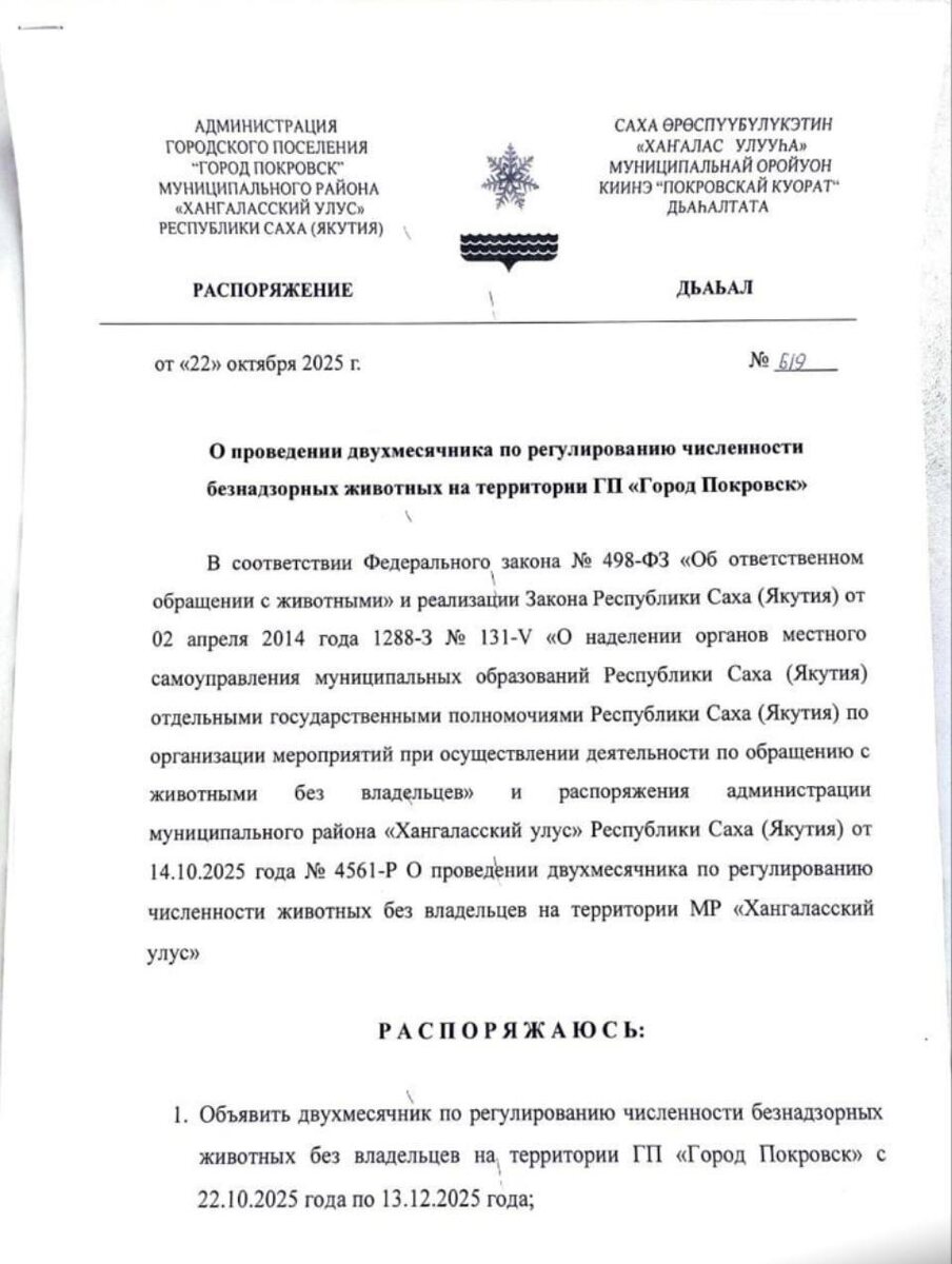 В г.Покровске Хангаласского улуса объявлен двухмесячник по регулированию численности безнадзорных животных без владельцев - с 22 октября по 13 декабря 2025 года.