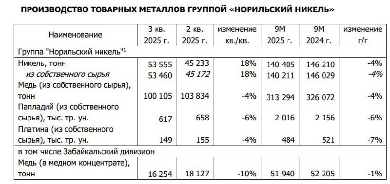 💿Норникель - операционные результаты за 3 кв 2025г: 📈Производство никеля выросло на 18% кв/кв до 53,55 тыс т, 📉Производство меди снизилось на 4% кв/кв до 100,1 тыс т, 📉Производство палладия упало на 6% кв/кв до 617 тыс тр ун 📉Производство платины снизилось на 4% кв/кв до 149 тыс тр ун отчет #GMKN $GMKN #отчетность