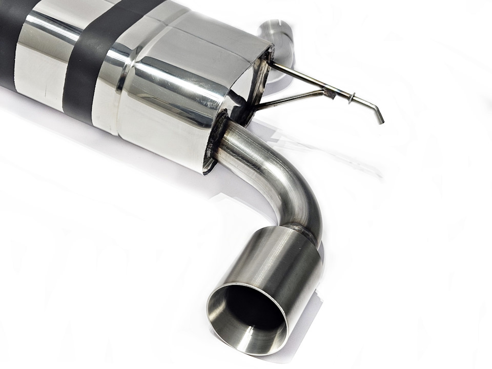Насадки выхлопной системы диаметром 100 мм, выполнены так же полностью из нержавеющей стали AISI 304. (Глушитель может быть укомплектован насадками меньшего или большего диаметра — по желанию). Патрубки — AISI 409. Глушитель Т-образного строение с камерой добавит басовитое звучание Вашему автомобилю. Данное сочетание материалов разительно отличает выхлопную систему MG-Race Performance от более дешевых и некачественных аналогов. Компонент Глушитель с насадками