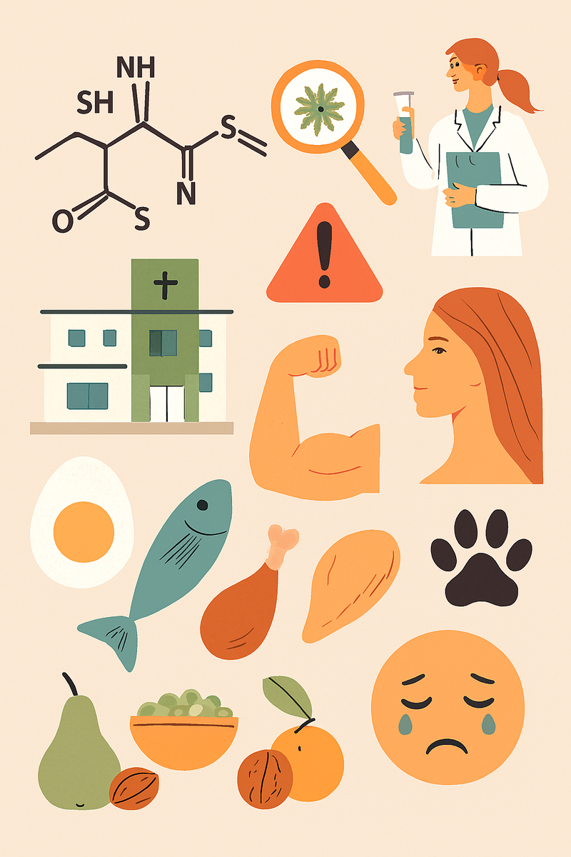 Метионин — это незаменимая аминокислота, которую наш организм не умеет производить сам. Мы получаем её только с пищей — из мяса, рыбы, яиц, молочных продуктов и орехов. Она играет ключевую роль в здоровье клеток, печени, кожи и даже настроения. --- Метионин был открыт в 1922 году из казеина (молочного белка). Это первая аминокислота, содержащая серу, которую учёные выделили и изучили. С тех пор она стала важной частью медицины, диетологии и биохимии. --- Строительный материал: участвует в синтезе белков, без него не растут и не обновляются клетки. Источник серы: превращается в другие важные вещества — цистеин, таурин, карнитин. Антиоксидант: помогает выводить токсины, защищает печень. Регулятор жиров: снижает накопление жира в печени. Успокаивающий эффект: снижает уровень гистамина, облегчая аллергии и тревожность. --- ✔️В медицине — при заболеваниях печени, интоксикациях, депрессии, аллергиях. ✔️В спорте — для восстановления мышц. ✔️В косметологии — для улучшения состояния